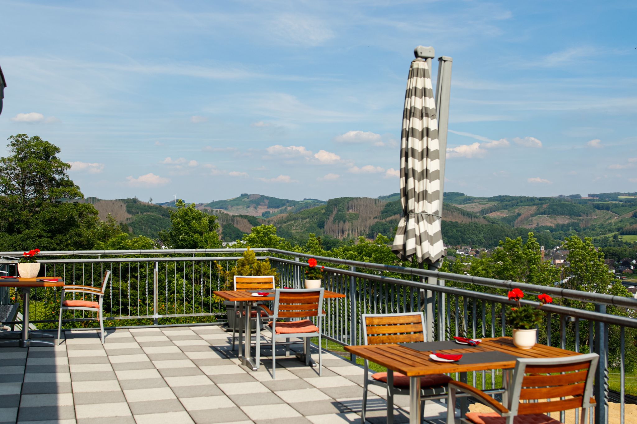 Geniet van onze smakelijke keuken, een selectie koffie en gebak of gewoon een fruitige cocktail op ons prachtige panoramaterras met een prachtig uitzicht over Bergneustadt en het Oberbergische Land.