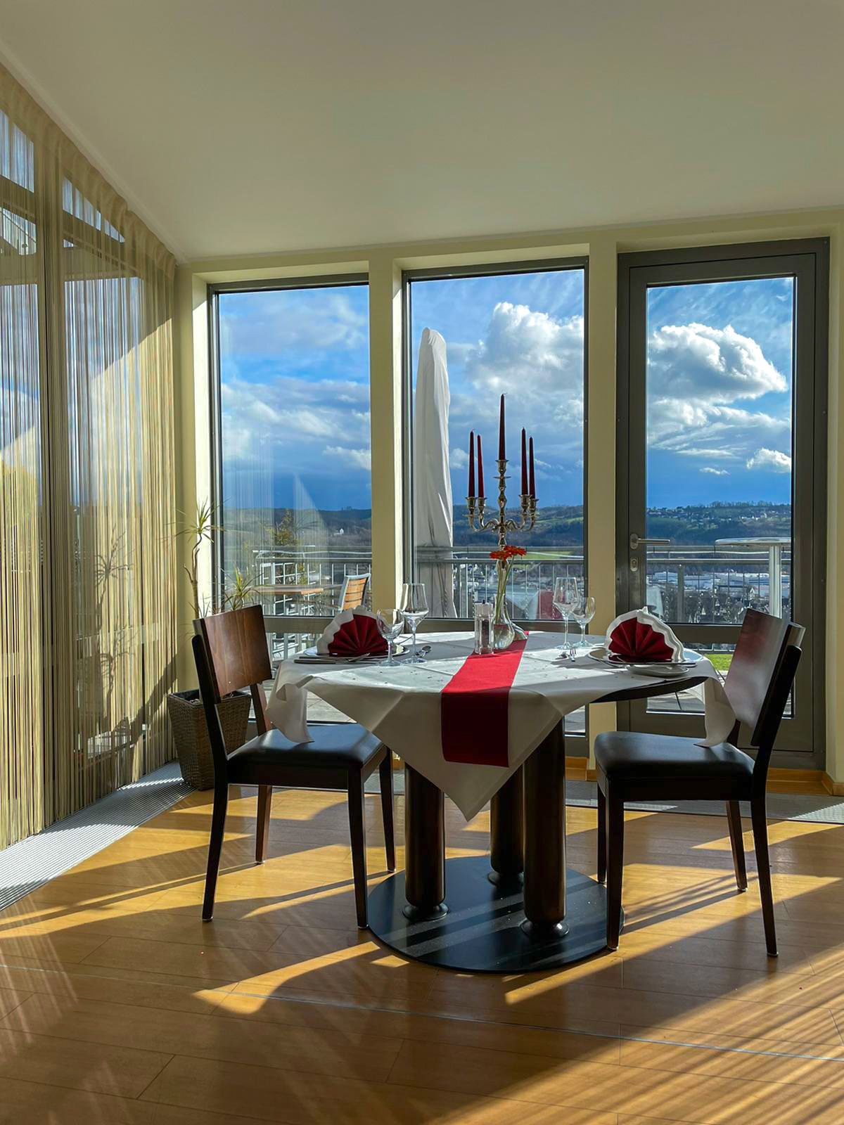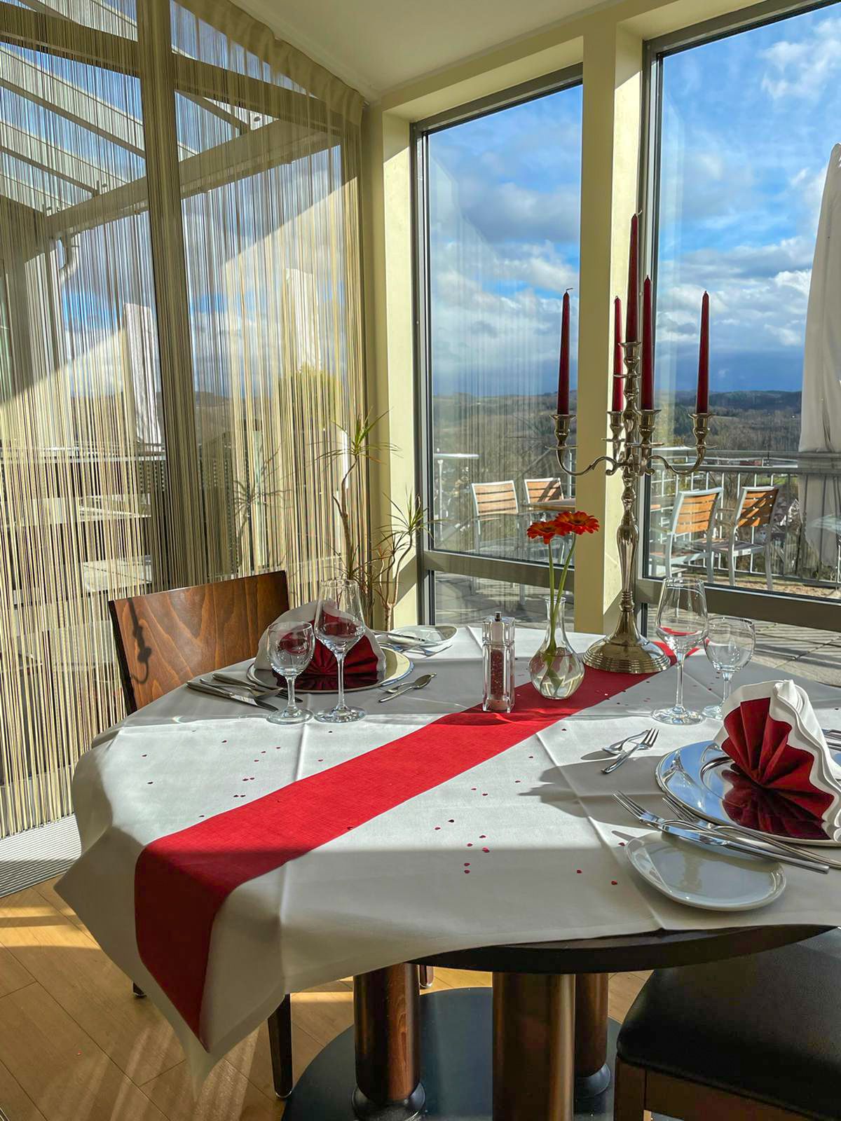 In unserem Restaurantbereich mit seinen rund 160 Sitzplätzen genießen Sie nicht nur nationale und internationale Köstlichkeiten, sondern auch eine traumhafte Aussicht über Bergneustadt. Wir laden herzlich auch unsere Gäste aus der Region ein, diesen besonderen Blick gemeinsam mit uns zu erleben und sich kulinarisch verwöhnen zu lassen.